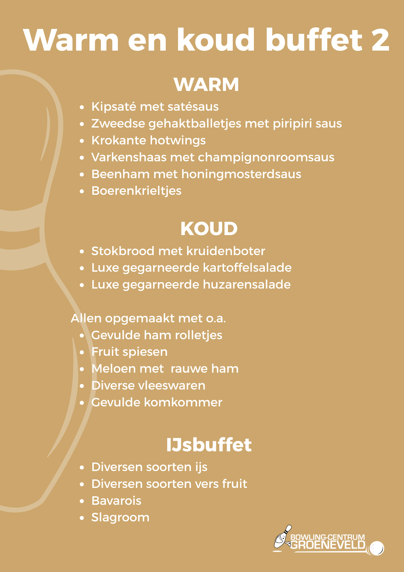 Voor gezelschappen boven de 20 personen biedt Bowlingcentrum Groeneveld heerlijke buffetten. Laat uw gasten het water in de mond lopen met ons zelf gemaakte buffetten. Wij hebben onze buffetten in 3 soorten opgedeeld. Uiteraard is het mogelijk om buffetten te combineren en ze precies op wens te laten maken.